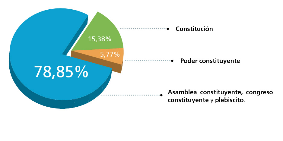 Al respecto, de las ideas ciudadanas recibidas por las web www.tuconstitucion.cl y catalogadas dentro de las temáticas mencionadas, en “Reforma y Cambio Constitucional”, un 15,38% de los aportes se refieren a la categoría “Constitución”, un 5,77% de las ideas hicieron referencia al concepto de “poder constituyente” y un 78,85% de las participaciones se refirieron a los mecanismos de reforma constitucional, específicamente tres: asamblea constituyente, congreso constituyente y plebiscito.