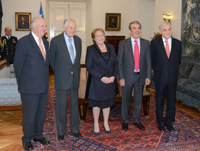 Los ex Mandatarios Ricardo Lagos, Patricio Aylwin, Eduardo Frei y Sebastián Piñera fueron recibidos por la Presidenta Michelle Bachelet en La Moneda, quien expresó “Todos han ratificado, por un lado, su voluntad de unidad frente a esta temática y de colaboración, por el otro”.