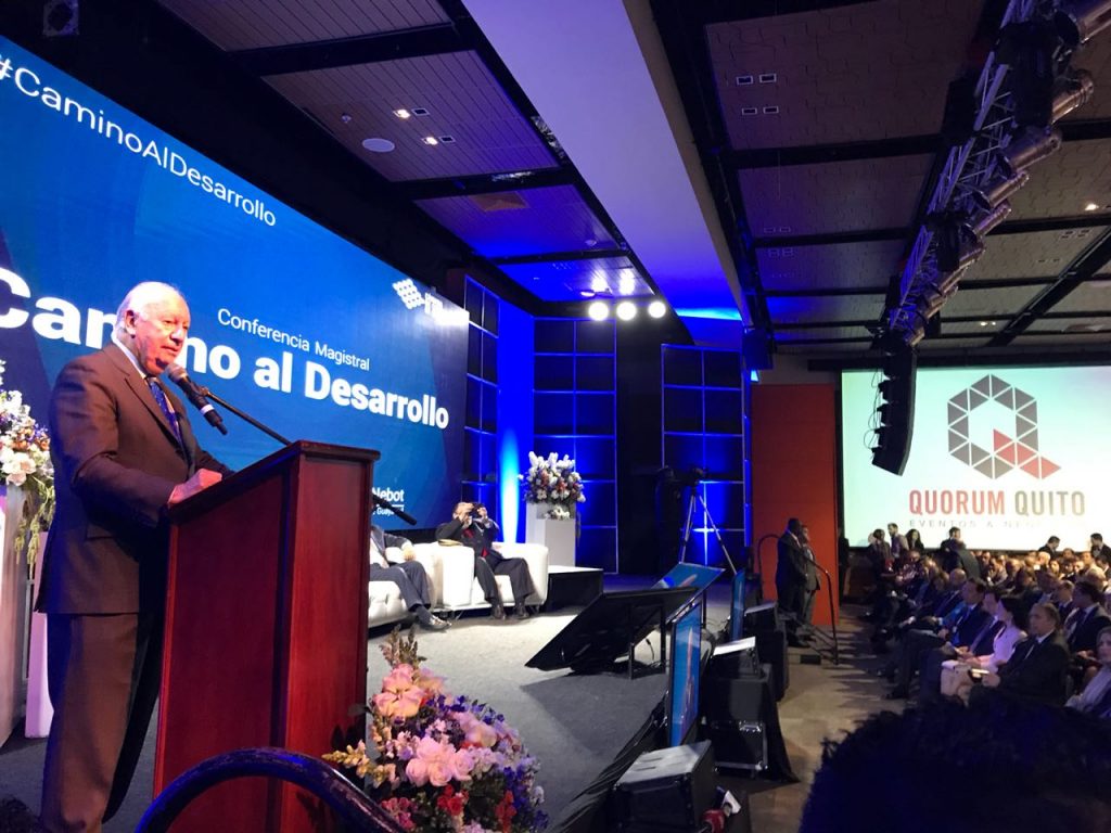 El expresidente de Chile Ricardo Lagos y el alcalde de Guayaquil, Jaime Nebot, participaron de un conversatorio internacional este miércoles 13 de junio del 2018, en el Quorum de Quito, Ecuador. En este encuentro, los dos ponentes hablaron de los modelos de desarrollo calificados como exitosos.